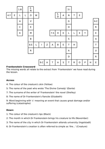 Frankenstein Crossword for KS3 Teaching Resources