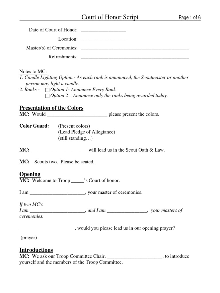 Sample Court of Honor Script Youth Movements Scouting