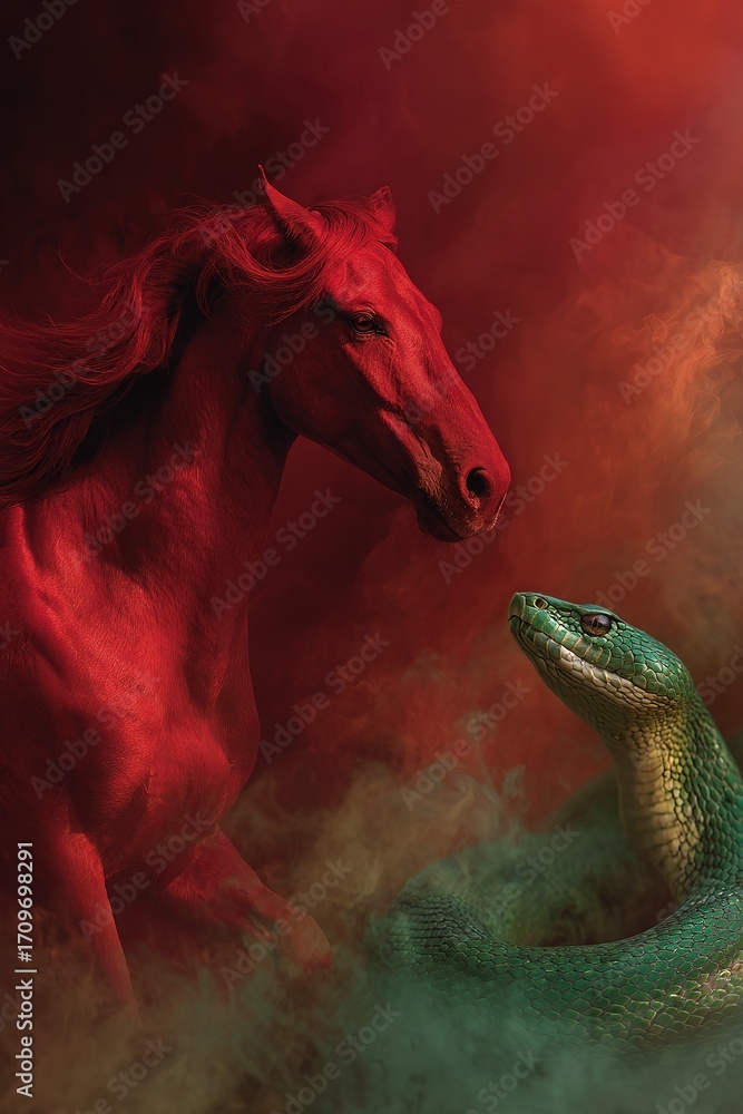 Symbols of 2025 and 2026 red fire horse and green snake confronting